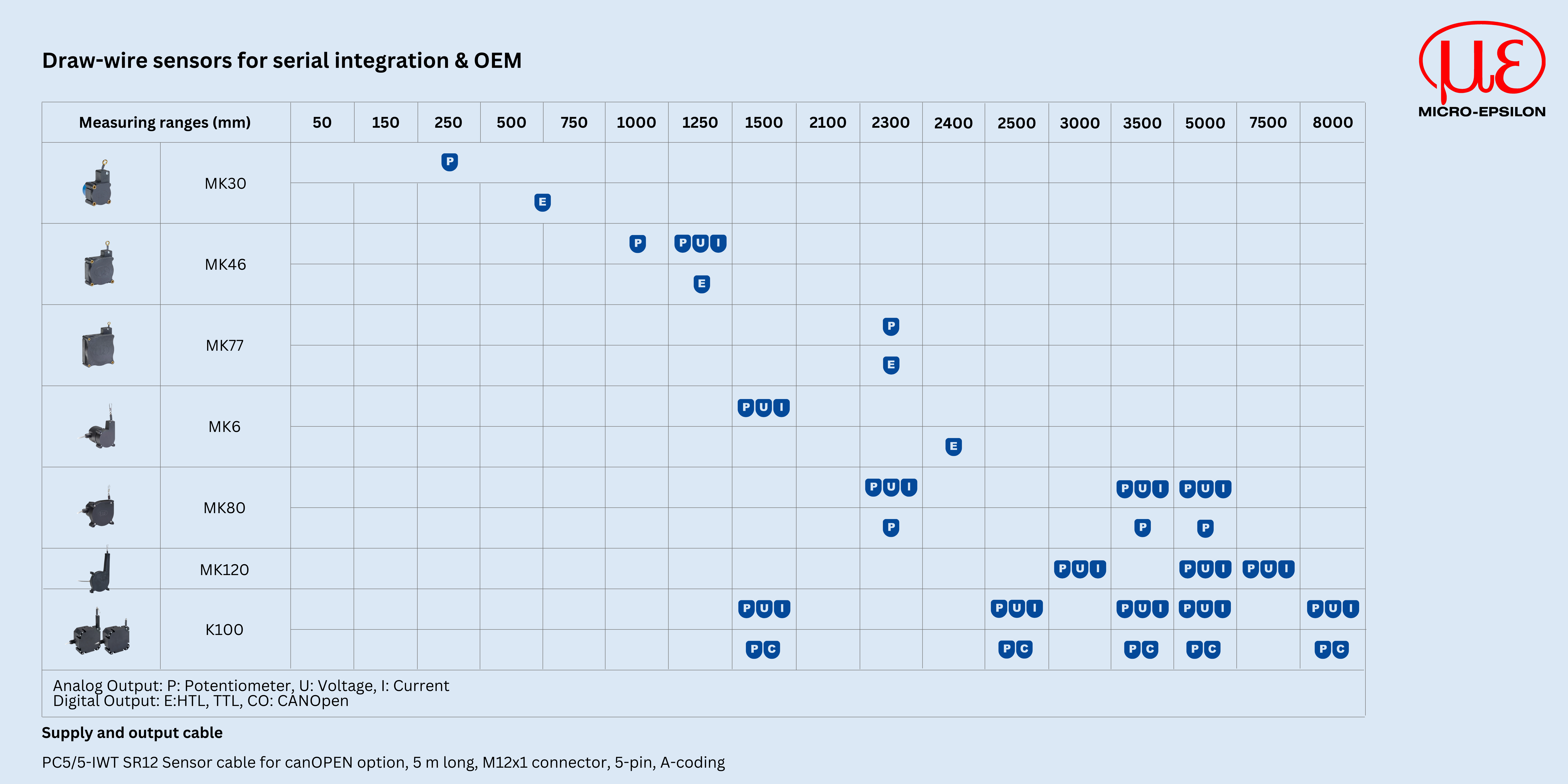 The K and MK draw-wire sensors are specially designed for series applications with large numbers of pieces. The user benefits from an excellent price/performance ratio and compact sensor dimensions, therefore gaining new potential in design and cost optimization. As well as analog versions with potentiometer, current or voltage output, digital versions with incremental or absolute encoders are available.