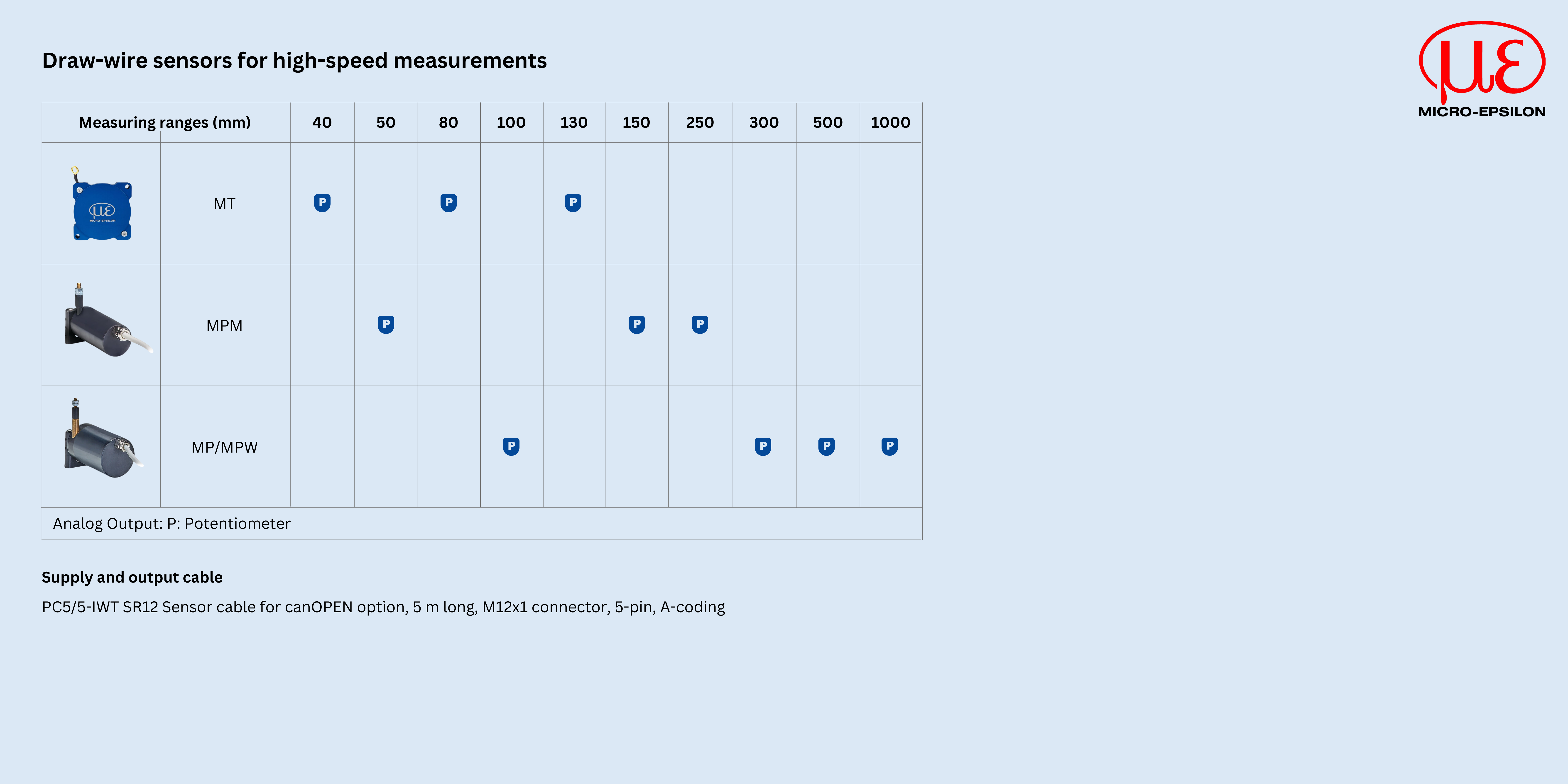 | Miniature MP and MT draw-wire sensors are designed for measurement tasks with fast wire movements. Their robust aluminum housing makes the sensors suitable for industrial applications. The MP and MT draw-wire sensors are equipped with a potentiometer. |