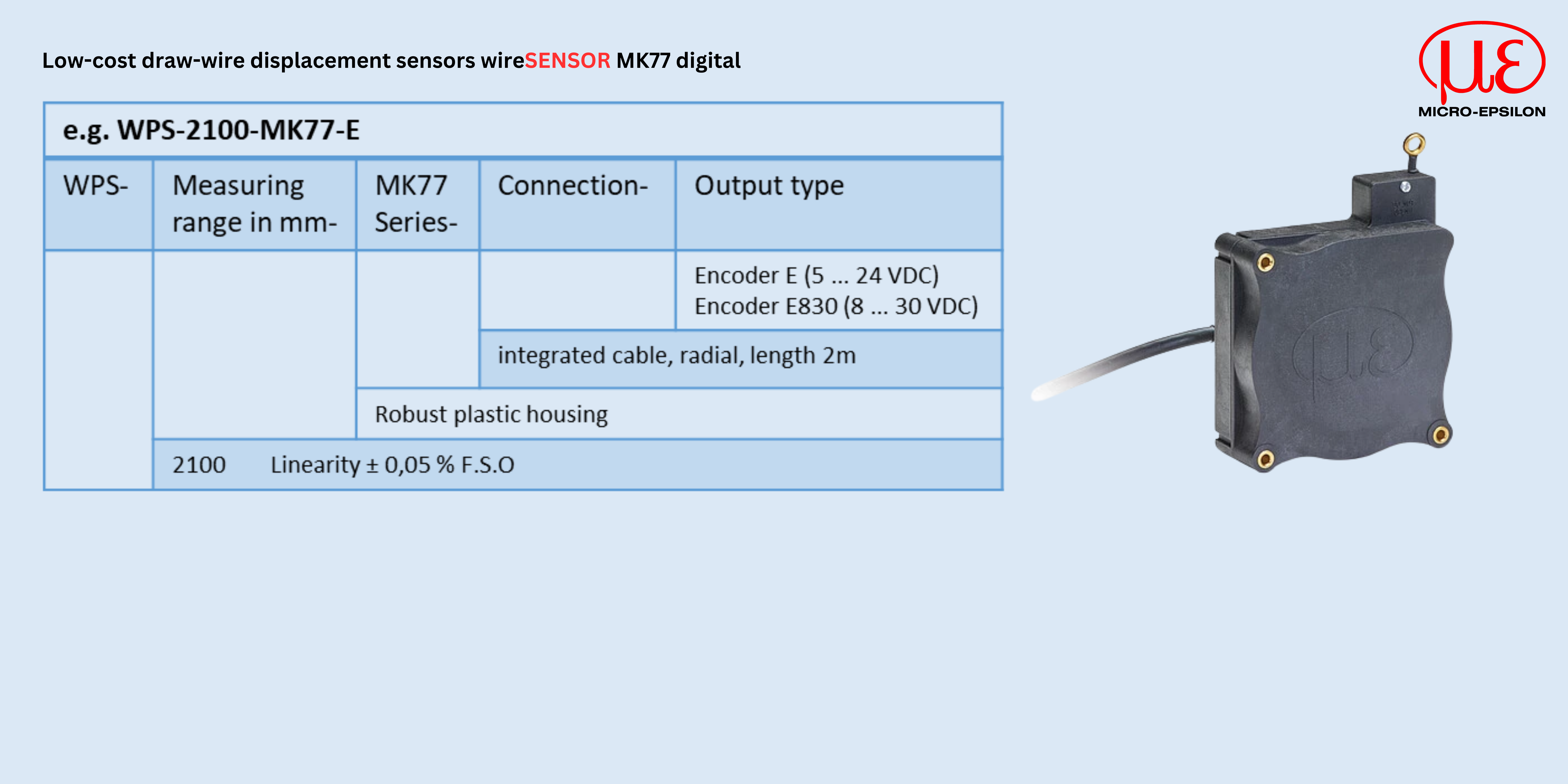 The miniature draw-wire sensors of the MK series are specially designed for use in high-volume production. Due to the favorable price and the compact size of the sensor, new potential designs and cost optimization are the benefits to the user.