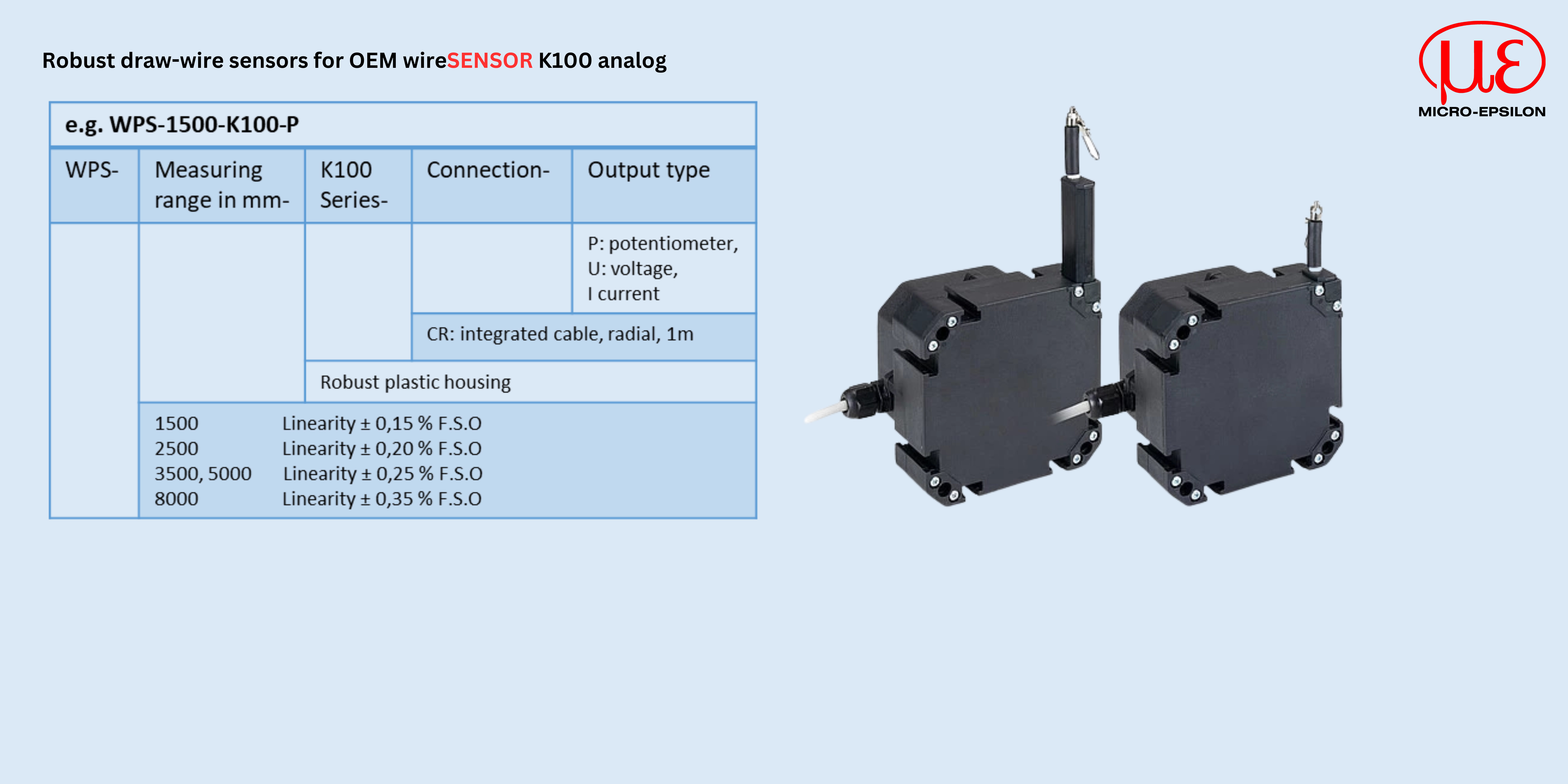 The K100 is specially designed for series use in mobile machines such as telescopic loaders or truck cranes. Its compact and robust housing (IP67/IP69K) made from glass-fiber reinforced plastic and its durable sensor design with separate drum and spring spaces offer increased protection against environmental influences. Specially in outdoor use, these sensors can be optimally adapted to the respective application.