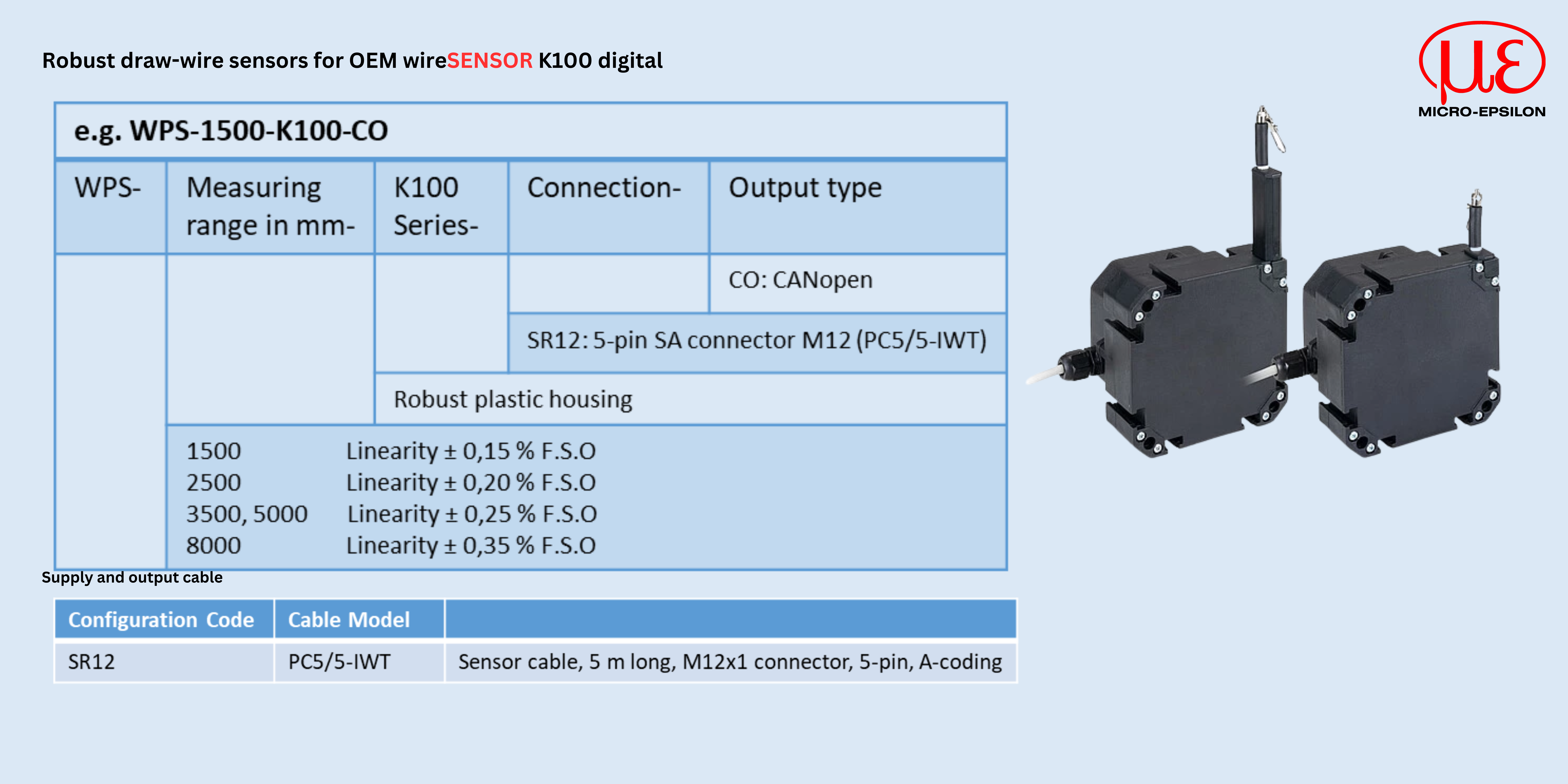 The K100 is specially designed for series use in mobile machines such as telescopic loaders or truck cranes. Its compact and robust housing (IP67/IP69K) made from glass-fiber reinforced plastic and its durable sensor design with separate drum and spring spaces offer increased protection against environmental influences. Specially in outdoor use, these sensors can be optimally adapted to the respective application.